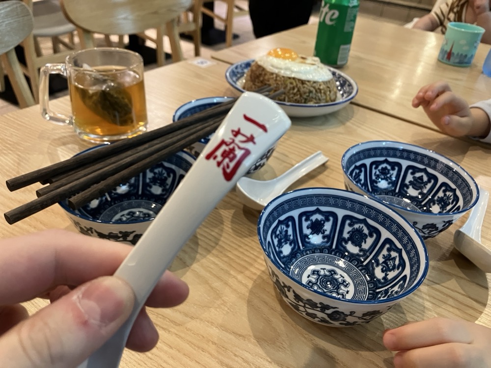ここのお店、どうやらお冷、取り皿、スプーン、箸含めて客がセルフサービスする形式らしく、スプーンを取りに行ったら、何故か一蘭のレンゲを発見笑