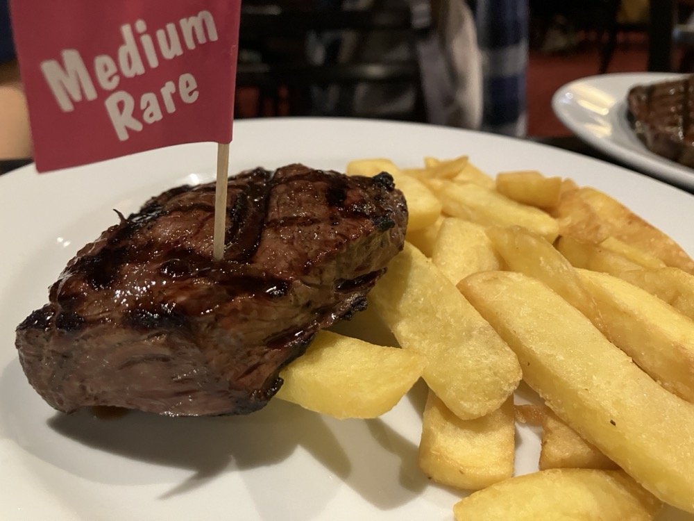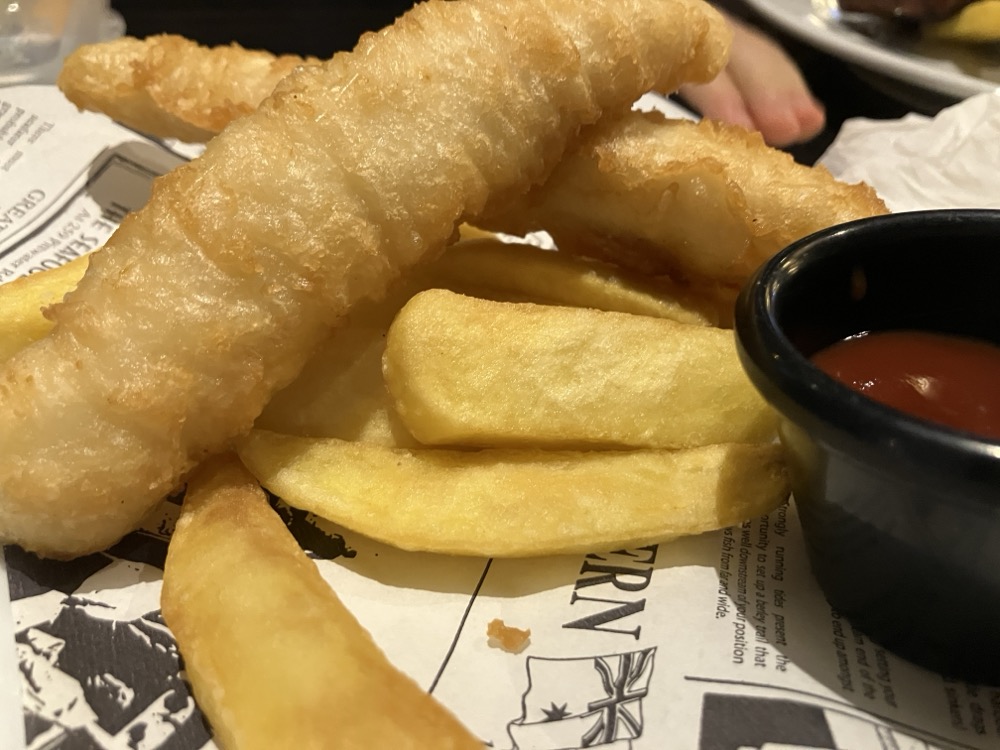 夜ご飯はマロニーズホテルという、宿泊施設はないホテル?にてステーキ食べた!美味しかった!フィッシュ&チップスがすごい、クソでかフィッシュ&チップス!