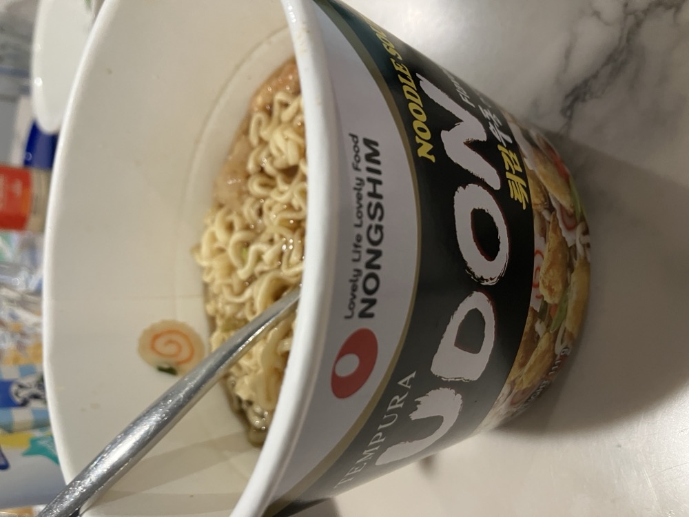 ジャパニーズUDON!!!!!麺の太さは焼きそば程度、なんかピリ辛な味だったんですがよくよく見ると表紙韓国語じゃね??笑